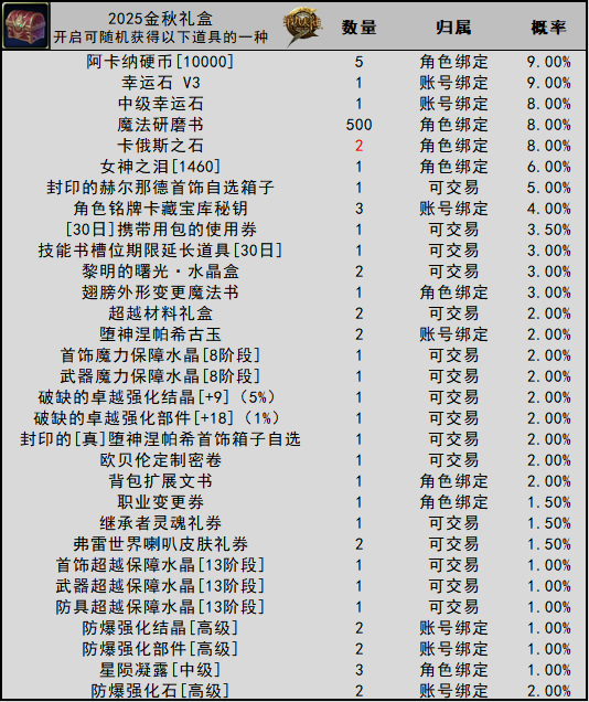 购买后获得自选箱子,可根据自身种族选择获得对应的盲盒箱子。奖励范围包括初级奖励、中级奖励及高级奖励三类,每类奖励的道具均有一定的获得概率。初级奖励的获得概率为45%,中级奖励的获得概率为35%,高级奖励的获得概率为20%。