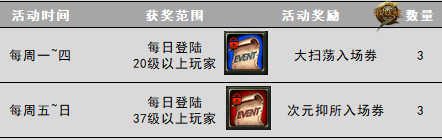 活动期间,所有37级以上冒险家每天可在活动NPC“莱伊利”处领取3张“次元抑制所入场券”。20级以上冒险家在活动时间内每天都可领取“大扫荡入场券”3张。